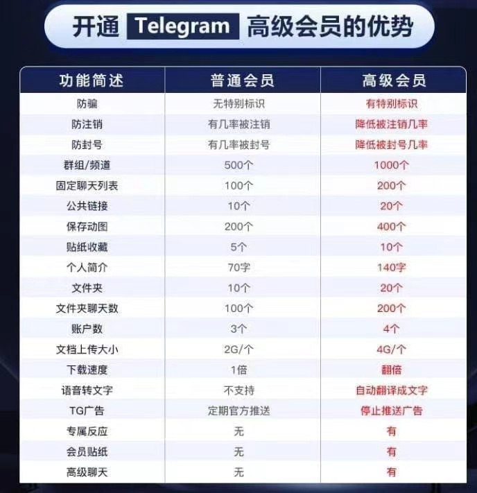 群组频道上限翻倍/语音消息转文本/更快的下载速度/实时翻译/动态 Emoji/上传更大文件/Emoji状态/微章标志/高级对话管理/无广告/应用图标/无限的表情回应/动态头像/Premium 贴纸。